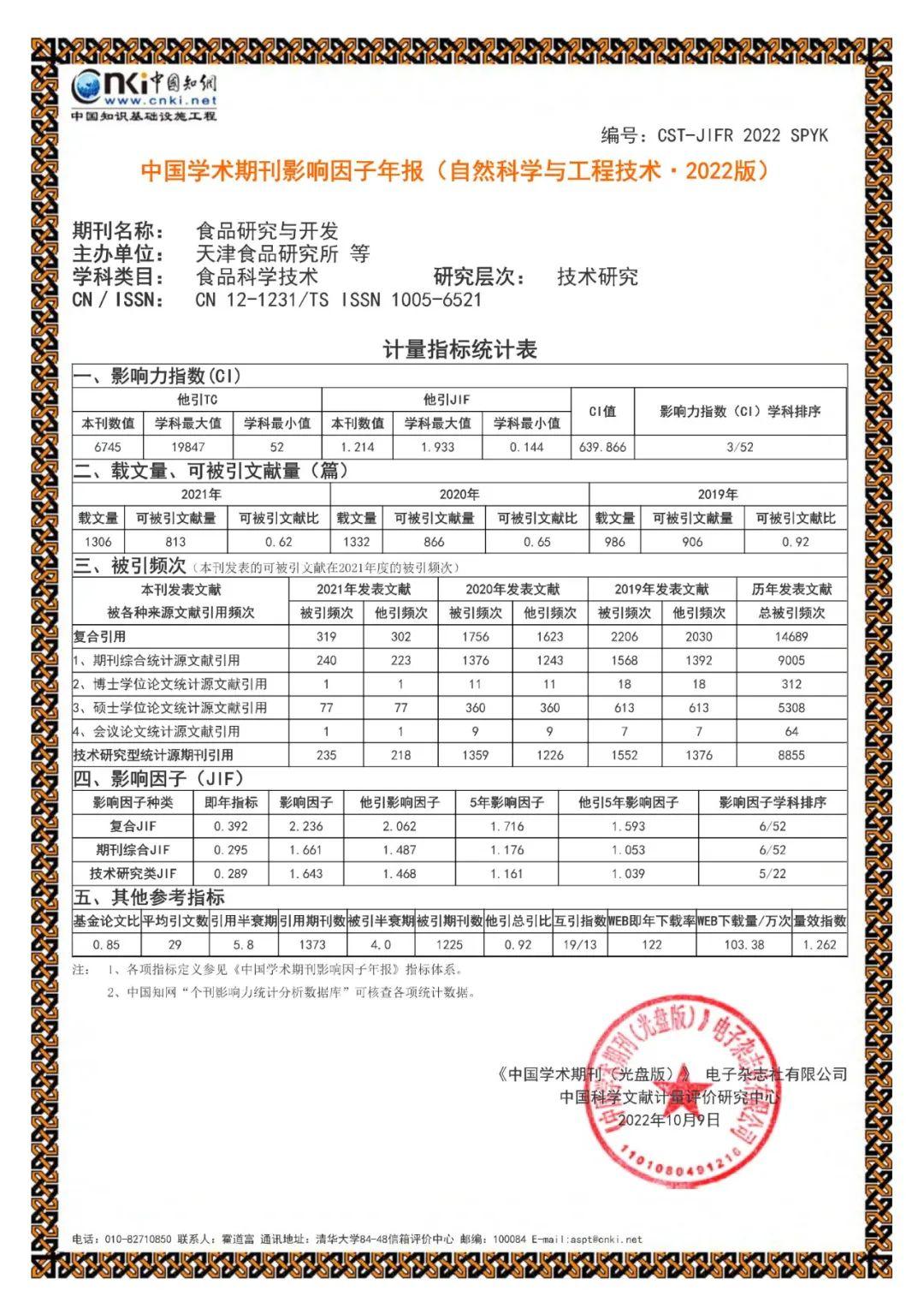 日前,中國(guó)學(xué)術(shù)期刊(光盤版)電子雜志社有限公司、中國(guó)科學(xué)文獻(xiàn)計(jì)量評(píng)價(jià)研究中心編制出版的《中國(guó)學(xué)術(shù)期刊影響因子年報(bào)(自然科學(xué)與工程技術(shù)·2022版)》正式發(fā)布。食品集團(tuán)主管,天津市食品研究所主辦的期刊《食品研究與開發(fā)》的影響力指數(shù)穩(wěn)居本學(xué)科第三位。