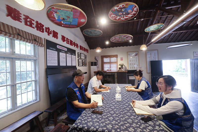 6月18日,在嘉興市秀洲區(qū)王店鎮(zhèn)慶豐村網(wǎng)格議事站內(nèi),網(wǎng)格長、網(wǎng)格員們召開網(wǎng)格議事會,討論村里目前碰到的新情況。新華社記者 徐昱 攝