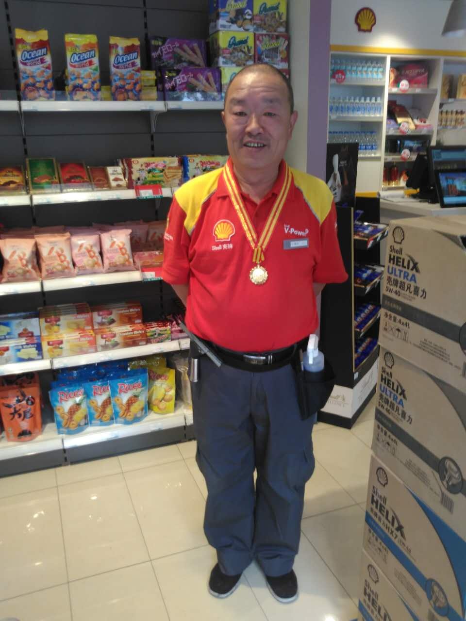 2001年-2002年,在殼牌開展為期六個季度服務標兵評選活動中,每一階段,王師傅均被評為服務標兵。曾有一次, 殼牌中國的同事來到白堤路油站參觀,交流之余問起王師傅:“您身邊的同事要是情緒不好是不是會影響到您。”老師傅很自信的說:“不可能,只有我能影響別人,別人不會影響到我。”王師傅就是這么自信,他始終會把他良好的工作狀態一直傳遞給身邊的每一位同事,正是由于年復一年、日復一日的努力工作使其獲得了“2015殼牌全球微笑之星”的榮譽稱號,并作為中國員工代表到日本參加全球盛典,接受殼牌授予的最高榮譽。